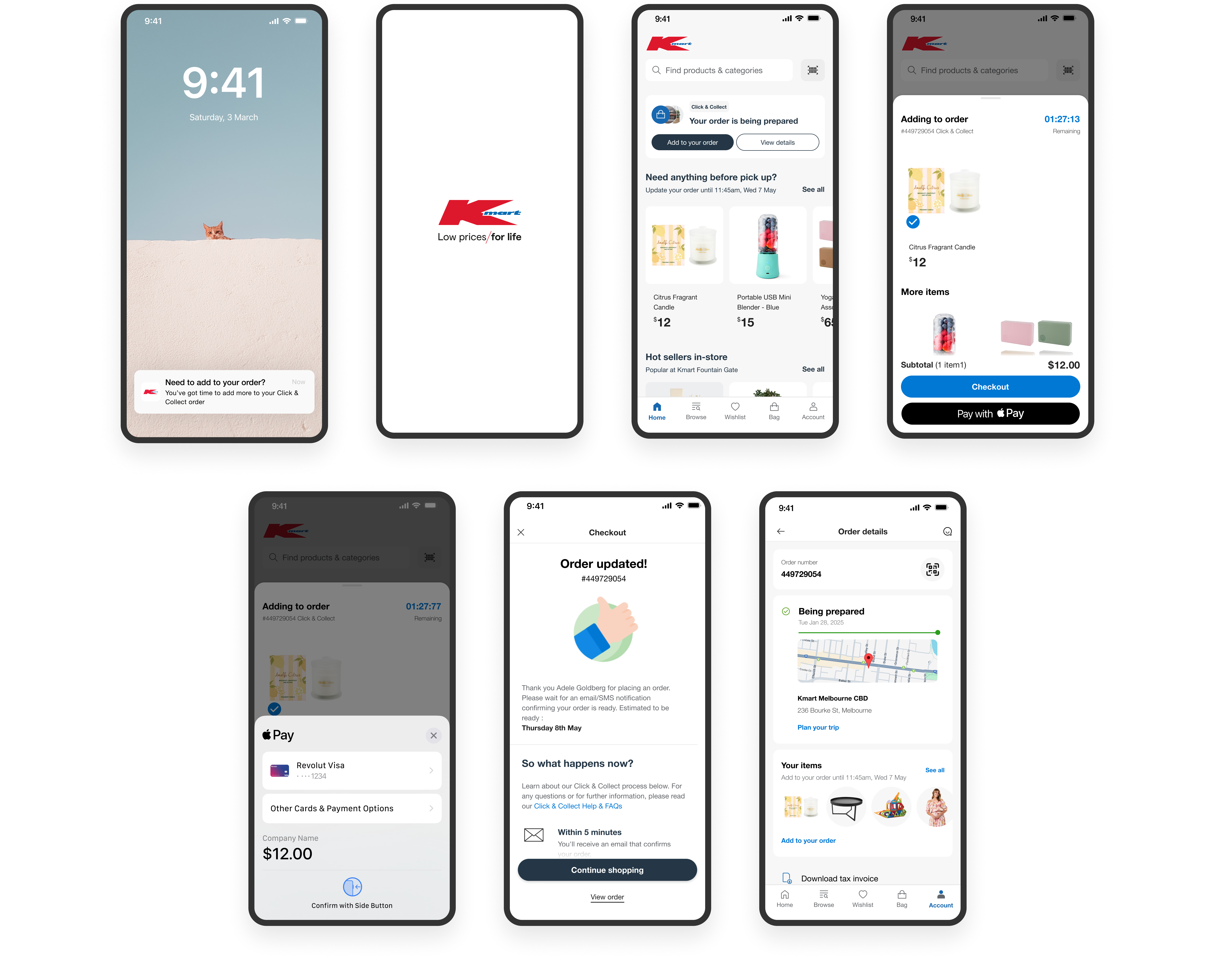 In 2024–2025, I designed three mobile payment concepts for Kmart's app, each tested directly with customers in-store. Two concepts were part of "value accelerator" sessions — rapid validation sprints where we tested lofi screens in the morning, iterated with devs, and re-tested refined designs the same afternoon. The third was tested separately with a similar approach.